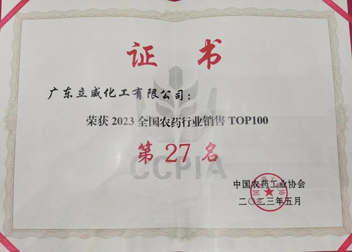 2023年5月16日,中國(guó)農(nóng)藥工業(yè)協(xié)會(huì)發(fā)布了2023全國(guó)農(nóng)藥行業(yè)銷售TOP100名單。廣東立威化工有限公司再創(chuàng)佳績(jī),以35.97億元的銷售額位居全國(guó)排名第27名。